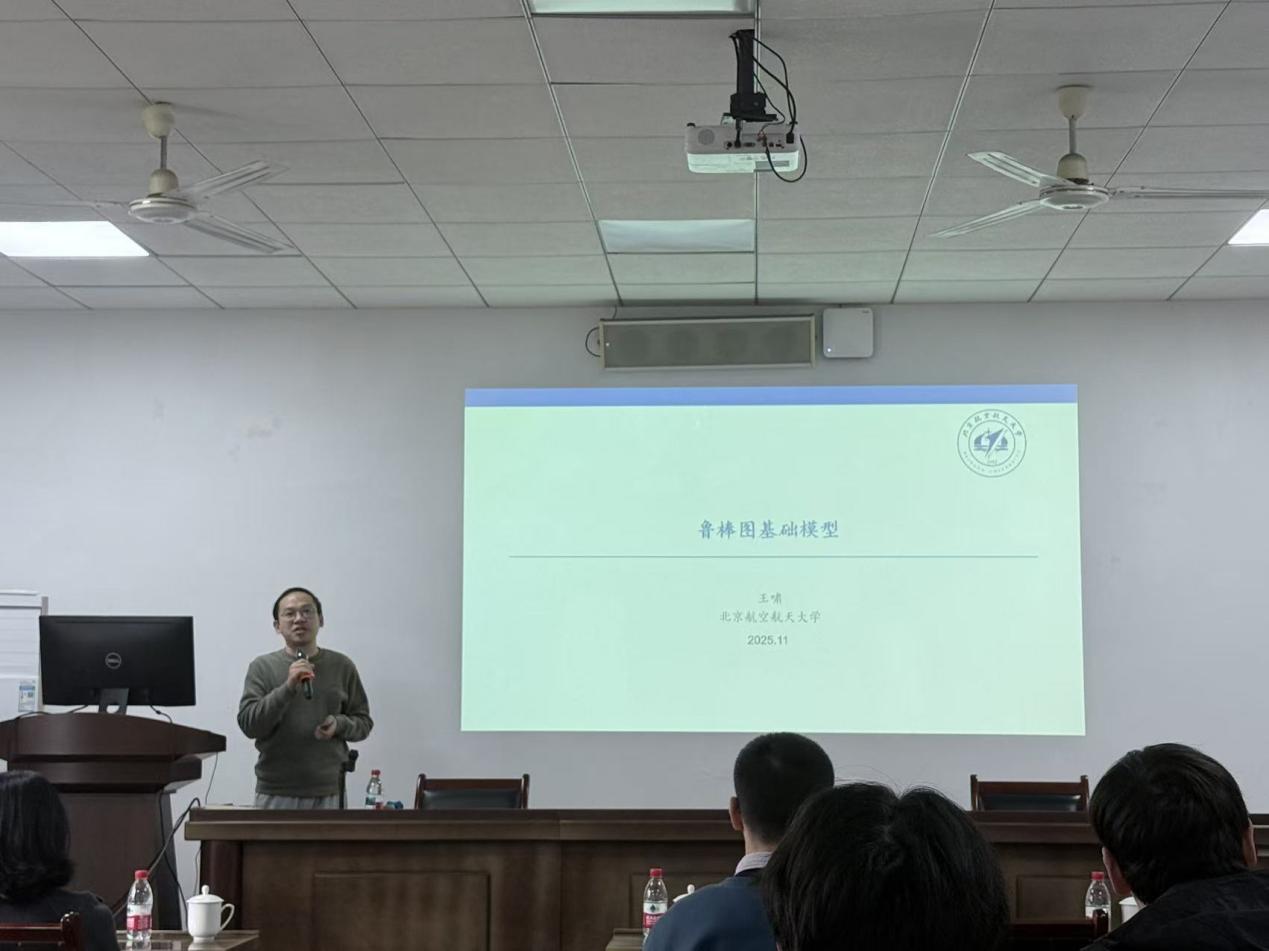 随后,北京航空航天大学王啸教授以《鲁棒图基础模型》为题,探讨图表征学习范式的变革方向。王教授抛出 “图Transformer中注意力机制的全局属性是否始终有效”“大语言模型能否提升图神经网络鲁棒性” 两大开放性问题,引发在场师生思考。他指出,随着LLM 在多领域突破,图表征学习正从传统GNN 向GNN 与大模型结合方向转型。