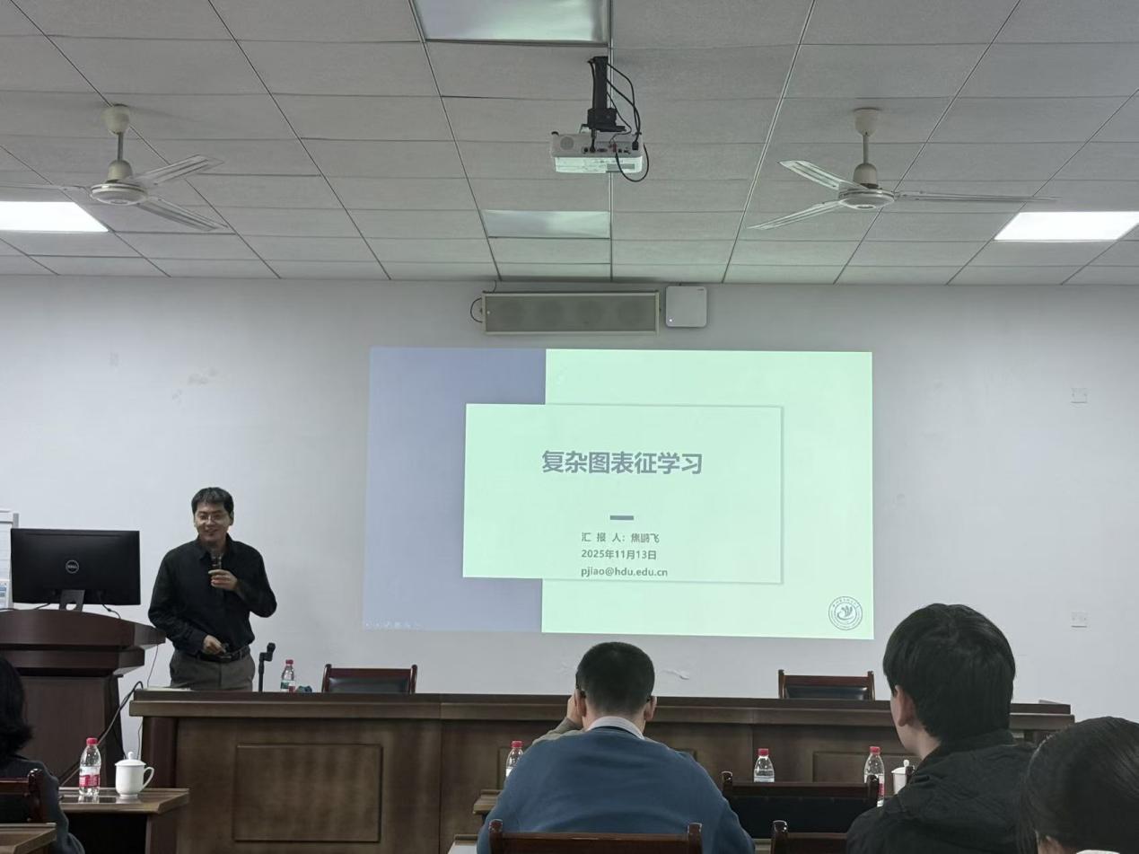 最后,杭州电子科技大学焦鹏飞研究员聚焦图机器学习在人工智能、数据挖掘与网络空间安全领域的应用挑战与突破。报告中,焦研究员指出图数据存在 “语义信息多元、链接模式多样、演化行为多变、隐私安全缺乏” 四大核心挑战,并介绍了团队构建的复杂图表征学习方法体系。