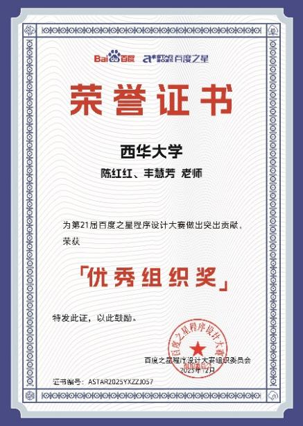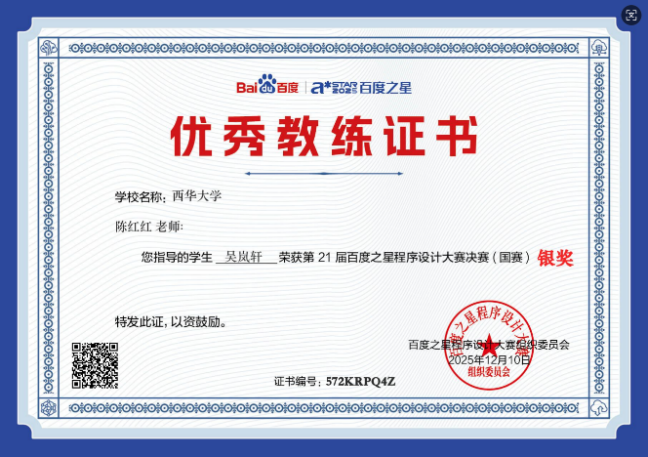 12月7日晚,第21届“百度之星”程序设计大赛全国总决赛在北京昌平落下帷幕。西华大学计算机与软件工程学院学子吴岚轩斩获全国银奖,实现学校在该项赛事中的历史性突破;同院肖代阳同学荣获优秀奖。学校同时被授予“优秀组织奖”,成为本届赛事中为数不多实现“学生获奖+组织表彰”双丰收的高校之一。