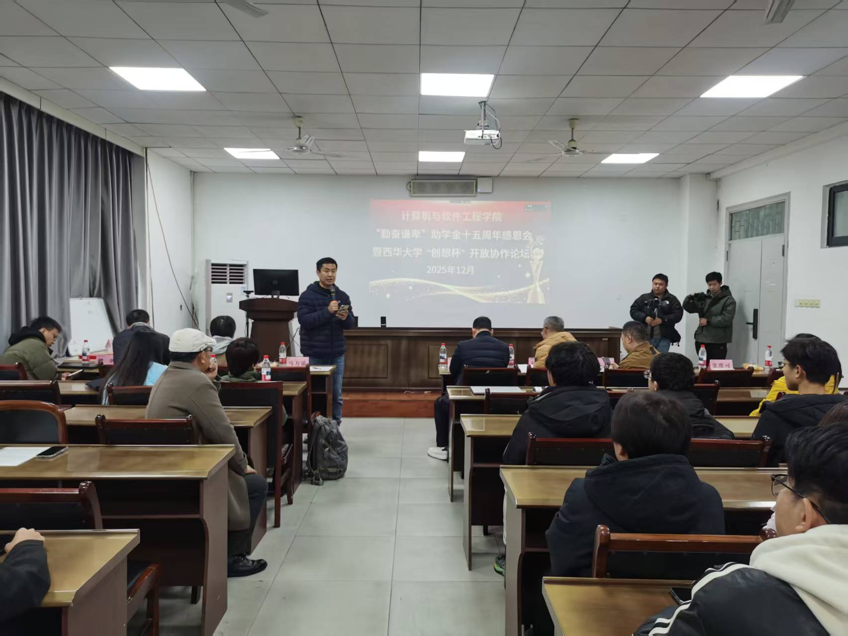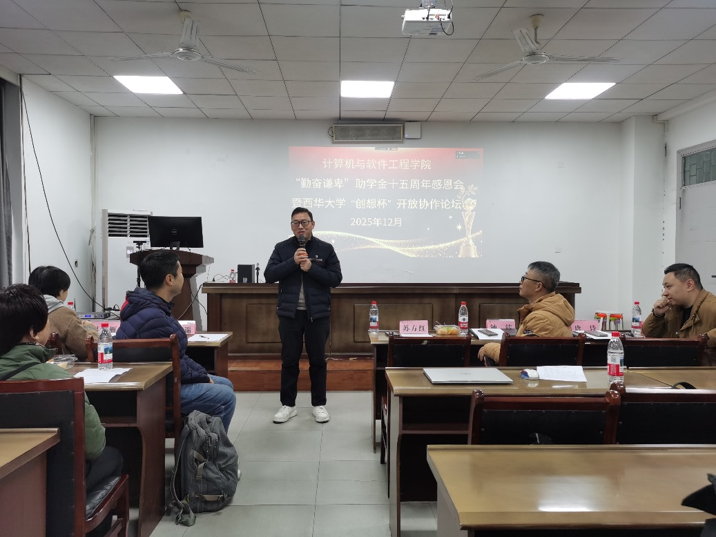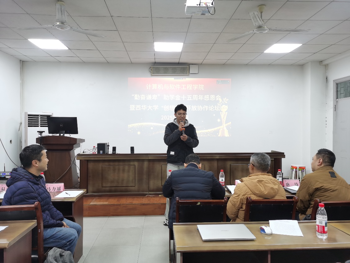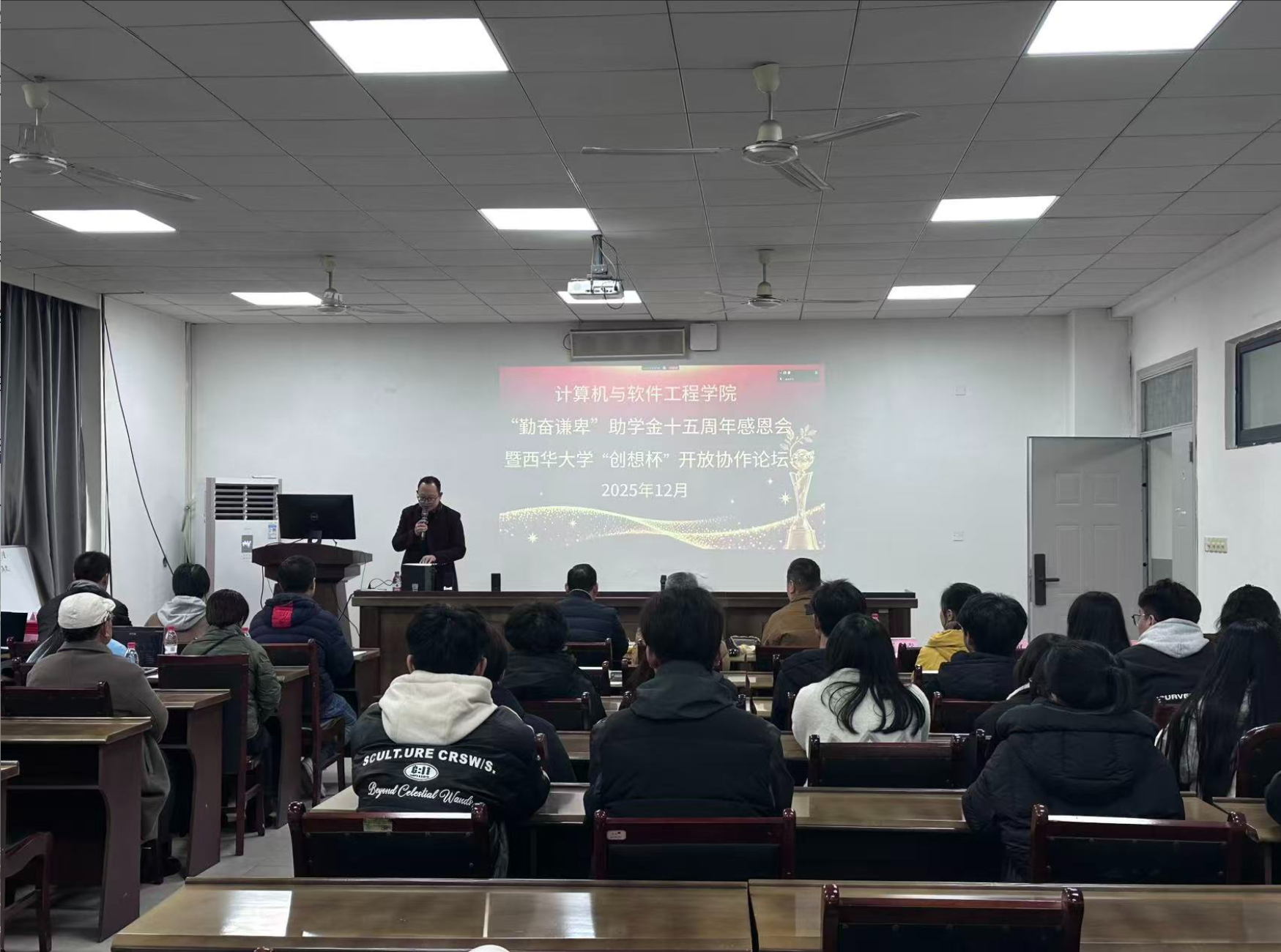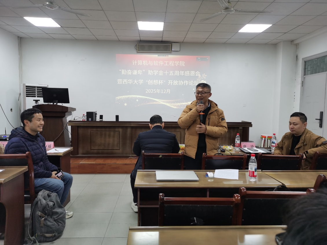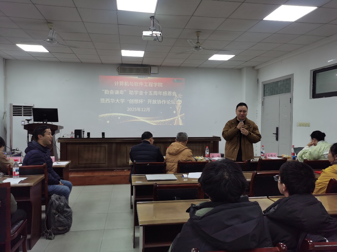 12月6日下午,计算机与软件工程学院在6A520举行了“勤奋谦卑”助学金十五周年感恩会暨创想社区开放协作论坛,师生齐聚一堂,共忆十五载助学初心,共话创想协作新未来。退休教师宋文老师、和灵贤老师,校友马力遥、苏方红、钟铸、陈春、唐诗、陈亮江,企业专家易鸿雁、陈春、卿明、石垚、张维可,学院党委副书记李欣,辅导员韩强等参加了活动。此次活动是校友开展值年返校活动,更是推动校企合作的重要实践。“勤奋谦卑”助学金是由98级校友马力遥、刘科佑等牵头设立的,对勤奋好学、家庭困难的优秀在校大学生进行资助的校友助学金,至2025年已经陪伴计算机与软件工程学院学子走过了15个年头。