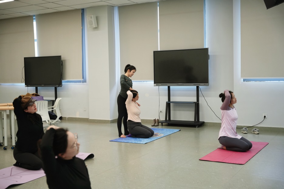 学院分工会特邀专业瑜伽导师授课,结合高校教职工长期伏案、久坐备课的职业特点,精心设计零基础友好课程。导师从呼吸调整、体态矫正入手,细致讲解肩颈放松、脊柱舒展、核心激活等基础体式,耐心示范动作要领,逐一纠正姿势偏差,帮助大家在安全舒适的状态下感受瑜伽魅力。