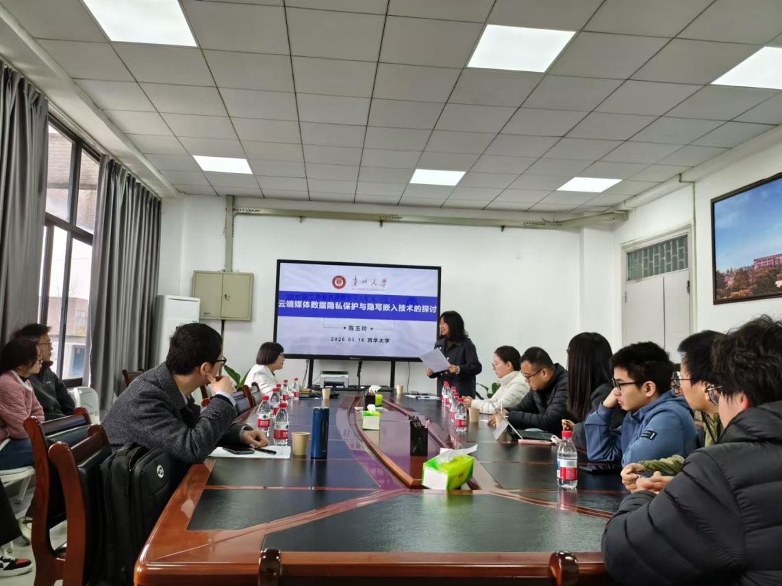2026年3月16日上午10点,西华大学计算机与软件工程学院邀请贵州大学陈玉玲教授,在6A-519会议室作了题为“云端媒体数据隐私保护与隐写嵌入技术的探讨”的学术报告。本次报告由曾晟珂副院长主持,众多相关专业的师生到场聆听,共同聚焦云端媒体数据安全领域的前沿问题,碰撞学术思想的火花。