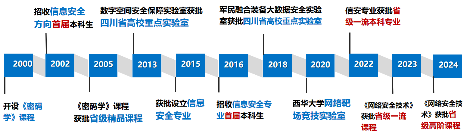 学院于2002年开始设置信息安全人才培养专业方向。依据“教育部学科发展与专业设置专家委员会”评议结果和《教育部关于公布2015年度普通高等学校本科专业备案或审批结果的通知》(教高函[2016]2号),2016年新增信息安全专业。经过20余年的发展,全力打造金课,多门课程进入省/校级一流的建设。围绕核心课程,立足学科竞赛,本专业建设了专业靶场实验室,成为培养网络安全高端技术实践能力型本科人才的重要基地。